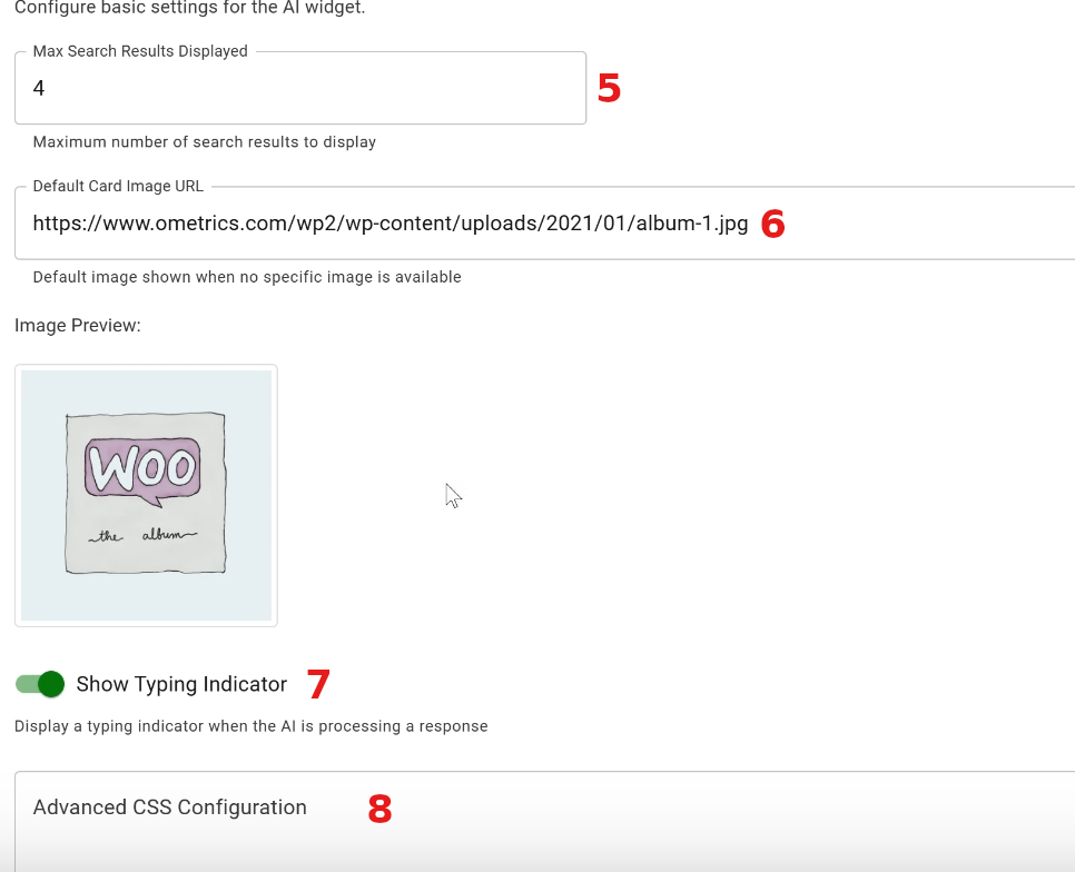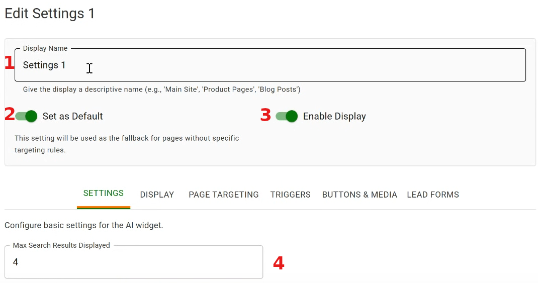 4. Max Search Results Displayed: Set how many results the AI should return when users search. Default is 4.